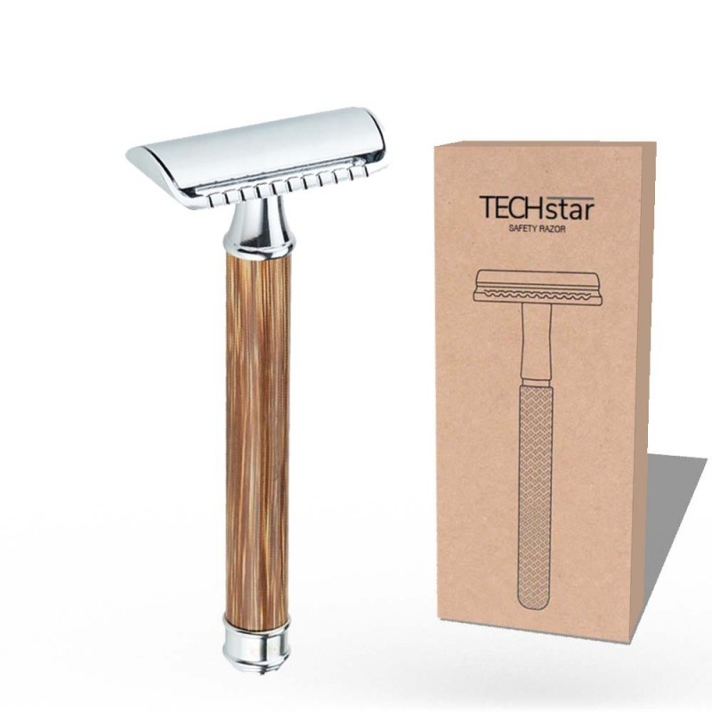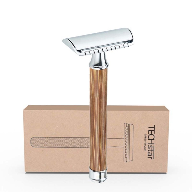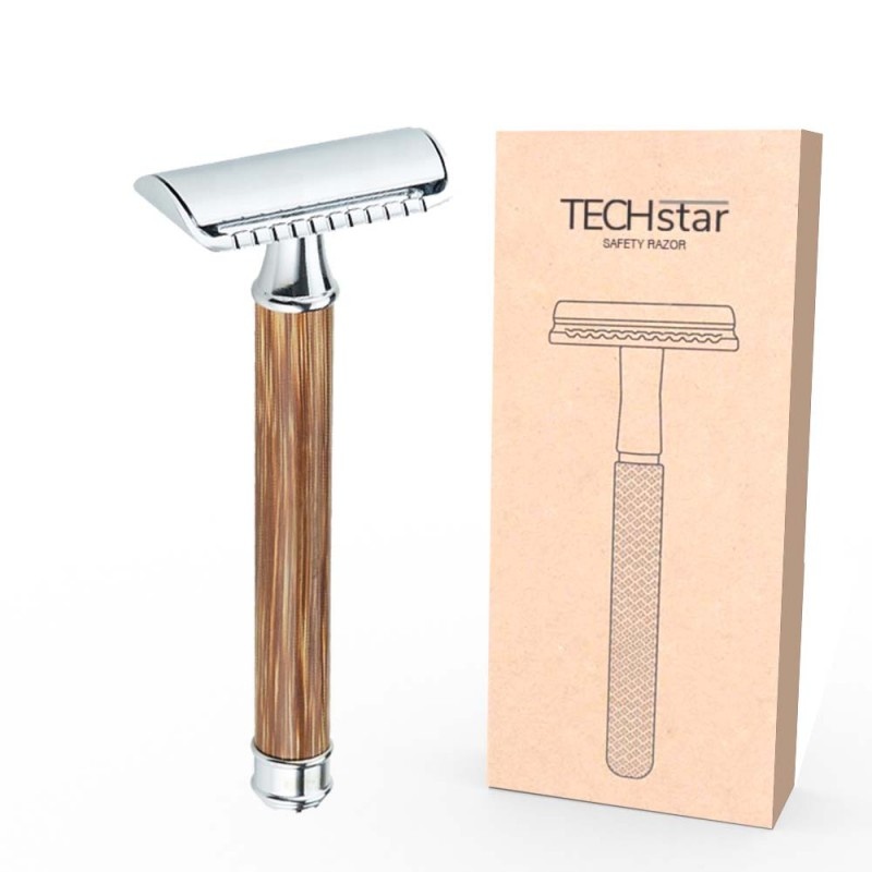 Aparat de ras Classic Safety Razor Techstar® SR12, Aliaj de Zinc, Cu Lame De Rezerva, Reutilizabil, Ecologic, Maner Bambus, Argintiu, Alte categorii