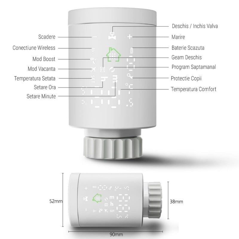 Termostatul Electric Smart de la Techstar este ideal pentru transformarea locuintei tale intr-o locuinta smart digitala. Noul design mini cu un ecran de afisare LED simplu si clar! Termostat electric de camera pentru radiatoarele de incalzire, inteligent si conectat la internet prin protocol ZigBee, functioneaza alaturi de celelalte echipamente ZigBee din casa dumneavoastra pentru o locuinta cu adevarat Smart. Poate fi controlat de pe telefonul mobil sau tableta prin aplicatiile Google Assistant, Amazon Alexa, Tuya, SmartHome etc. De asemenea, poate fi utilizat si prin comenzi vocale impreuna cu Google Home si Alexa *Necesita Gateway ZigBee ( nu este inclus ) Programare saptamanala Suporta configurarea manuala a programului saptamanal de 5+2,6+1 si 7 zile cu 6 perioade pentru optiune ,oferindu-va confortul maxim pentru diferite situatii si setarea unui program personalizat pentru temperatura casei dvs. mod de vacanta, mod automat, mod boost disponibil. alegeti modul zi de lucru si modul zi de odihna pentru a va satisface propria minte. Control vocal si de la distanta pentru Tuya ZigBee Wireless Suporta controlul de la distanta prin intermediul telefonului dvs. inteligent, impreuna cu controlul vocal hands-free prin Alexa si Google Assistant dupa conectarea cu succes a supapei dvs. la Tuya /Smart Life App pe baza unui Tuya ZigBee Wireless Gateway*. Gateway nu este inclus in pachet Detectare geam deschis Cand temperatura camerei scade brusc in pragul de temperatura, supapa se va inchide timp de 15 minute Avantajele unui Termostat Electric Smart sunt: Usor de instalat Fara fire Alimentare prin Baterii 2x AA 1.5V Economiseste energia Controlabil de la distanta Programabil direct de pe telefonul mobil Controlabil prin voce Setarea de scenarii Ecran LED Mod de programare: manual sau 1 ciclu/saptamana, cu 6 intervale orare/zi + 2 intervale orare/zi in weekend Senzor Temperatura Intern Protectie copii Conectiune Wireless si Configurare Usoara Compatibil Google Assistant, Amazon Alexa, Tuya, Smart Life, IFTTT etc Usor de instalat Se instaleaza in locul robinetului de la calorifer si controleaza precis si inteligent fluxul de agent termic prin calorifer. Nu necesita gaurirea peretilor, schimbatul tevilor sau fire de alimentare. Termostatul vine la pachet alatur i de 3 adaptoare pentru compatibilitate cu toate tipurile de calorifer. Aspect Modern Un design simplu, conservator dar Smart! Automatizare Incalzirea in pardoseala reprezinta una dintre cele mai eficiente solutii de incalzire. Obtine un mediu confortabil din punct de vedere termic pentru locuinte sau birouri. Cumpara un ambient pentru fiecare circuit de incalzire in podea din locuinta ta pentru o automatizare completa a incalzirii in pardoseala. Eficienta Automatizarea este capabila de a reduce consumul de energie al incalzirii cu pana la 40%. Practic, in timp ce incalzirea clasica pompeaza constant aceeasi temperatura in toata cladirea, automatizarea regleaza si eficientizeaza distributia agentului termic pentru fiecare incapere Astfel poti fii sigur ca toate incaperile tale au temperatura setata de tine. Scapa de camerele prea friguroase sau prea incalzite. Specificatii: Dimensiuni 53*89.5mm Senzor Temperatura NTC Temperatura maxima afisata: 1~70°C Temperatura reglabila: 5~35°C Filet prindere: M30*1.5 Consum maxim: 90mA