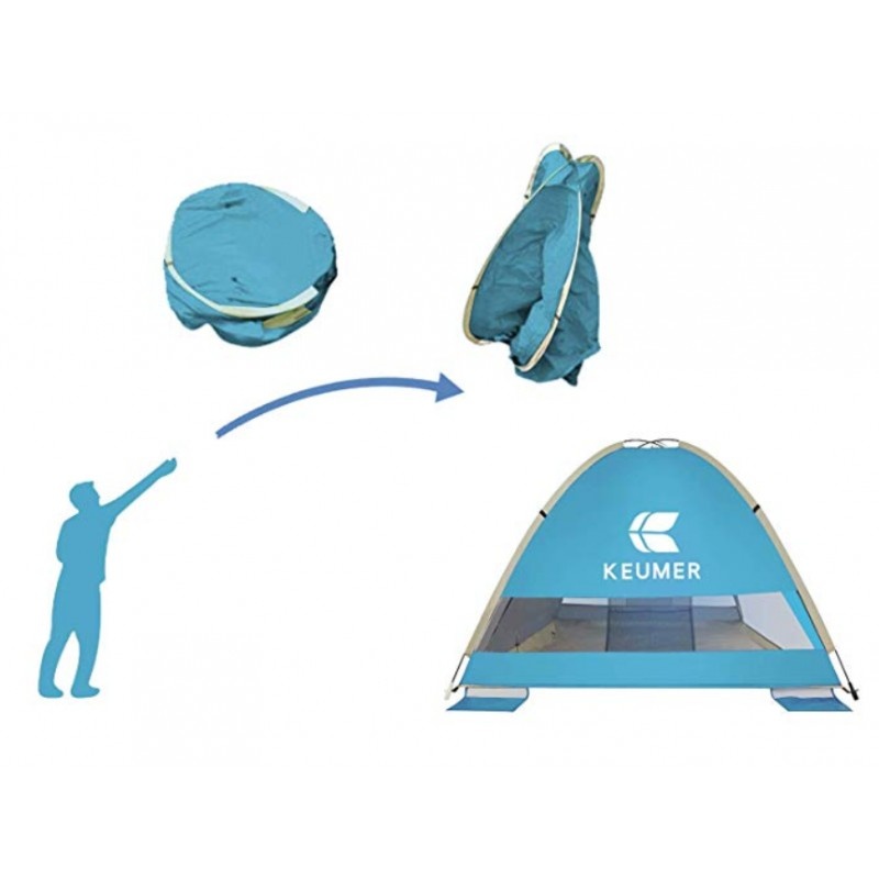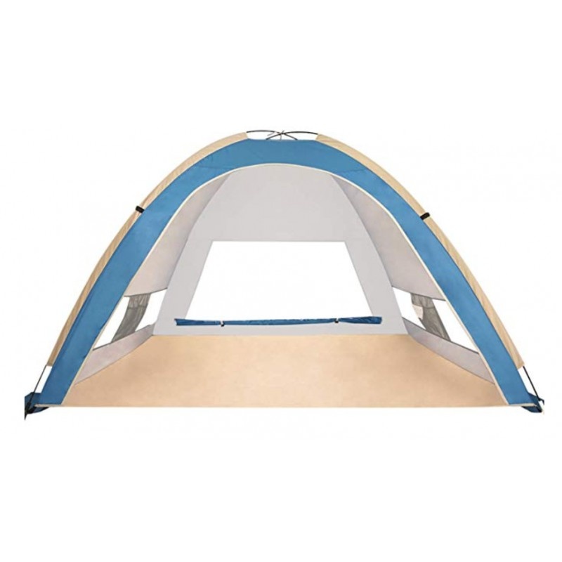 Cortul este fabricat din poliester 190T, un material rezistent la apă și la razele UV, ceea ce îl face ideal pentru utilizarea pe plajă. De asemenea, vine echipat cu o fereastră largă și două zone de aerisire pe lateral, asigurând un confort sporit în interior. Cortul se deschide automat în doar câteva secunde, ceea ce îl face extrem de practic.