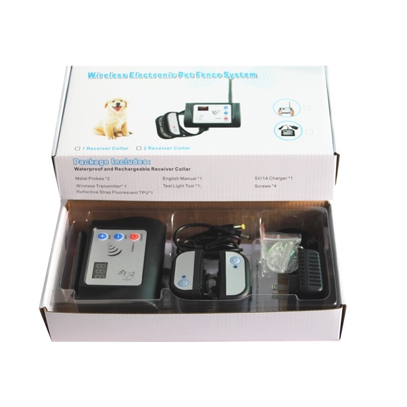 Sistemul de gard electronic pentru animale de companie garanteaza in siguranta antrenamentul pentru acestea. Acesta nu necesita cabluri și este foarte convenabil pentru a stabili zone sigure pentru comportamentul animalelor de companie. Centralizat în jurul transmițătorului, telecomanda poate ajunge la o rază de până la 300 metri și poate acoperi până la 28 de hectare. În acest spațiu de 300m, câinele dvs se poate juca liber și în siguranță, fără a vă îngrijora de activitățile lor sau de a se pierde. Ca rezultat, poate fi utilizat pe scară largă pentru instruirea în activități de familie sau în aer liber. Caracteristici principale: Sistemul de gard complet wireless, poate fi utilizat în exterior Semnalul este de tip circular, bazat pe transmițător și centru de comandă la distanță. Domeniu de control de până la 300 m Dacă câinele se află în afara razei telecomenzii, se porneste automat tonul de avertizare și modul de șoc electrostatic 5 semnale diferite ale transmitatorului, reprezentând domeniul de distanță Transmițătorul și receptorul nu trebuie să utilizeze codul, dupa ce se porneste poate primi funcționarea normală a semnalului Un transmițător acceptă simultan mai multe receptoare Zgarda receptorului este waterproof si reincarcabila. NOTA : A se incarca cel putin 4 ore pentru prima folosire. Receptorul este complet waterproof, poate fi folosit si in zilele ploioase. Zgarda detine material de tip TPU reflectorizant , ce poate ajuta la gasirea catelului pe timp de noapte. Aparatul va intra in modul de economisire a energiei ( sleep mode ) atunci cand este folosit pentru mai mult de 5 minute. In modul sleep, aparatul se va porni automat pentru a functiona cand este nevoie. Cablul de incarcare : Cablul pentru incarcare detine 2 capete, ce pot incarca emitatorul si receptorul in acelasi timp. NOTA : Raza de actiune a telecomenzii este masurata in zona deschisa si poate fi afectata de undele electromagnetice sau obstacole de tip pom, gard etc ce poate reduce distanta significant. Asezati emitatorul la o distanta de 1.5 metri deasupra solului fara pereti metalici in jur. In felul acesta veti putea beneficia de cel mai bun semnal. Important : Gardul wireless este doar pentru caini. Semnalul de baterie descarcata poate duce instant la oprirea dispozitivului. A nu fi folosit atunci cand bateria este descarcata Nu folositi zgarda mai mult de 10 ore pe zi. A se tine departe de copii. Va rugam a se citi toate instructiunile inainte de folosire. Transmitatorul : 3.7V 2500 mAh LiP Receptorul : 3.7V 400 mAh LiP