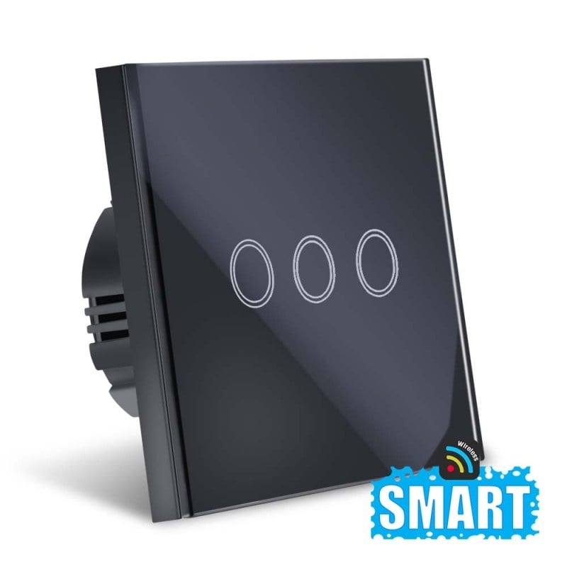 Intrerupator Smart Touch Techstar®, Wireless 2.4GHz, Sticla Securizata, Design Modern, Iluminare LED, 3 Faze, Negru, Intrerupatoare