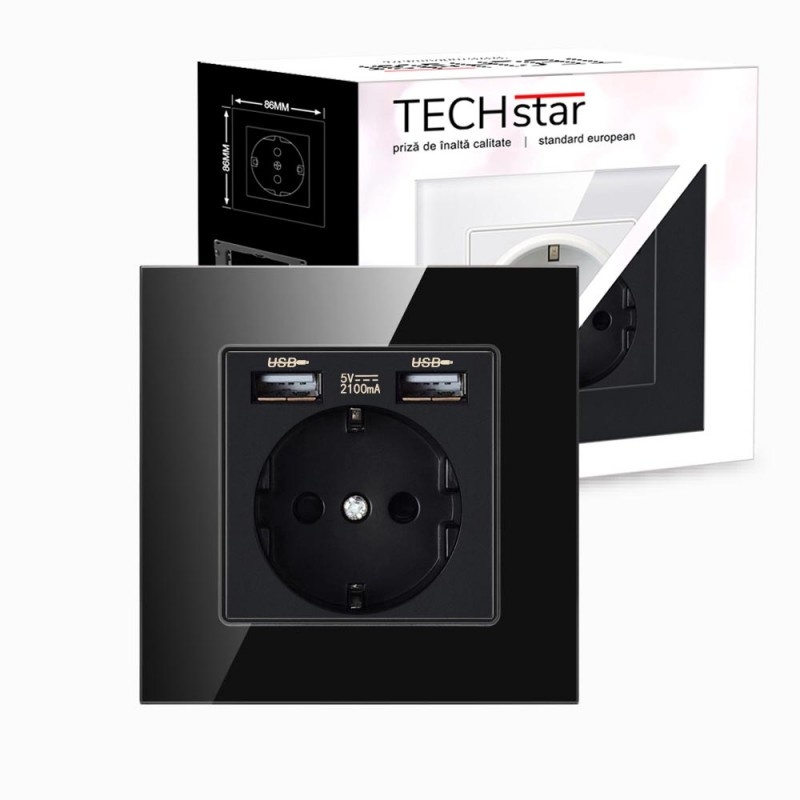 Priza Techstar® Crystal TSU1, Simpla, 2 x USB, 2.1 A, Culoare Negru Onyx, Sticla Securizata, 16A, Prize