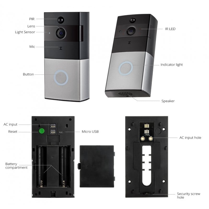 Interfon smart Techstar® Interfon fara fir wireless smart, videointerfon, wifi, functioneaza cu 2 baterii tip acumulator 18650 (nu sunt incluse) , alerta miscare, inregistrare cu card SD(nu este inclus) si comunicare bidirectionala Acest produs e o solutie excelenta pentru monitorizarea vizitatorilor chiar daca nu sunteti acasa puteti vedea si puteti comunica cu vizitatorii care va bat la usa si a va sti familia (copii) in siguranta. Soneria se conecteaza wi-fi la routerul din locuinta dumneavoastra si este online. Monitorizare video In momentul in care un vizitator actioneaza soneria, aplicatia instalata pe telefonul dumneavoastra va atentioneaza Puteti raspunde la apel si in acel moment, direct de pe telefon, se va stabili o conexiune video. Comunicare bidirectionala Pe langa feed-ul video, puteti vorbi cu persoana aflata in fata soneriei. Senzor de miscare Soneria beneficiaza si de senzor de miscare astfel ca va anunta in momentul cand este detectata miscare in fata usii. Sensibilitatea poate sa fie setata ca notificare sa fie trimisa la cea mai mica miscare sau daca se detecteaza miscare mai mult de 7 secunde. Veti putea vedea atunci cand cineva va fi in preajma usii dumneavoastra. Consum redus de energie Produsul functioneaza alimentat de 2 acumulatori de 18650 (nu sunt inclusi) cu o durata de viata de pana la 8 luni in functie de capacitate. Acestia pot fi incarcati cu un incarcator de baterii uzual sau incarcata soneria cu tot cu acumulatori printr-un cablu micro-USB. Inregistrare pe card Soneria poate sa inregistreze video si audio pe cardul SD (pana la 64GB si nu este inclus). Night vision Datorita ledurilor cu infrarosu soneria capteaza imagini foarte clare chiar daca este intuneric complet. Instalare facila Montarea se poate realiza foarte usor, recomandat este cu dibluri fixate in perete sau alt suport stabil de prindere.